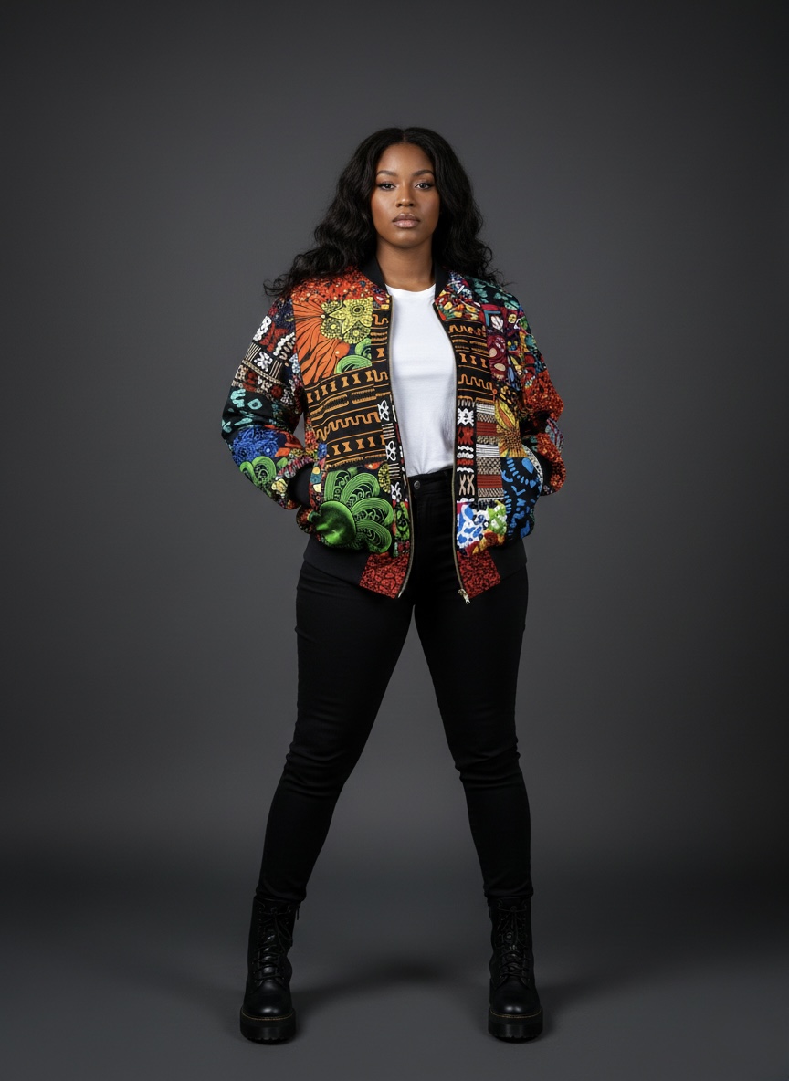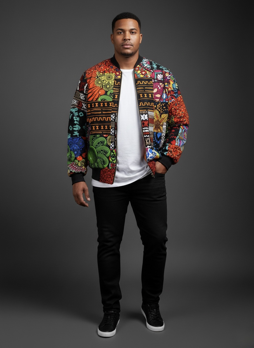 This unisex bomber jacket is designed for everyday wear and layering. The jacket features a multicolor patchwork print with African-inspired patterns across the front, sleeves, and back.